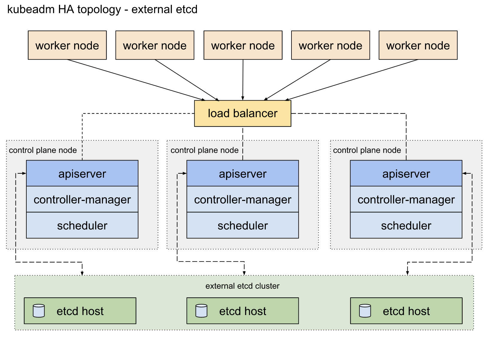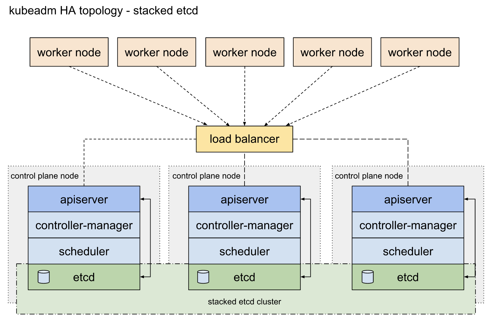 Kubernetes promotes two ways for HA topologies. One is with having stacked control plane nodes and this is a default choice in kubeadm. kubeadm is a recommended tool to set up a cluster with a thoughtful set of default configurations. It is advised to have a redundancy of minimum three-node for enterprises that employ stacked clusters.