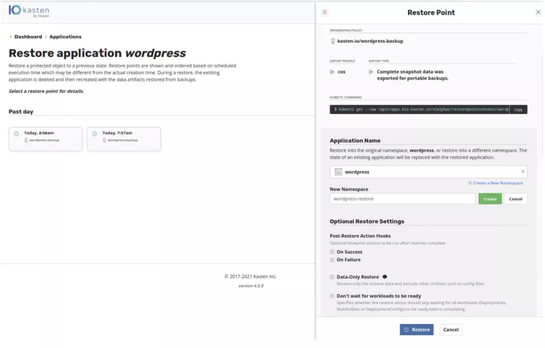 Create a Namespace for recovery, which is named as "Wordpress-restore" in this case.