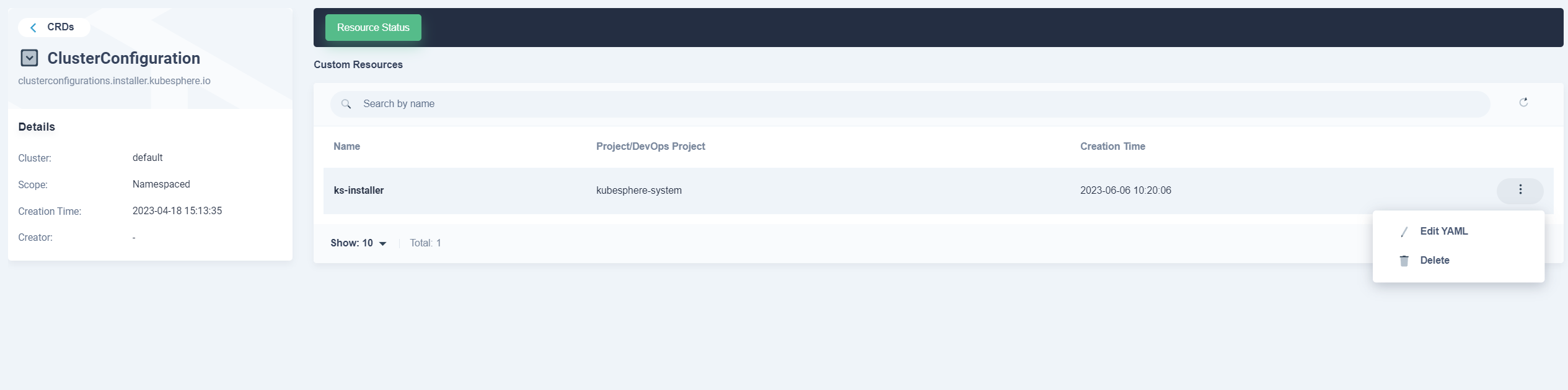 1. Under Custom Resources, click the three dots on the right side of ks-installer, select Edit YAML.