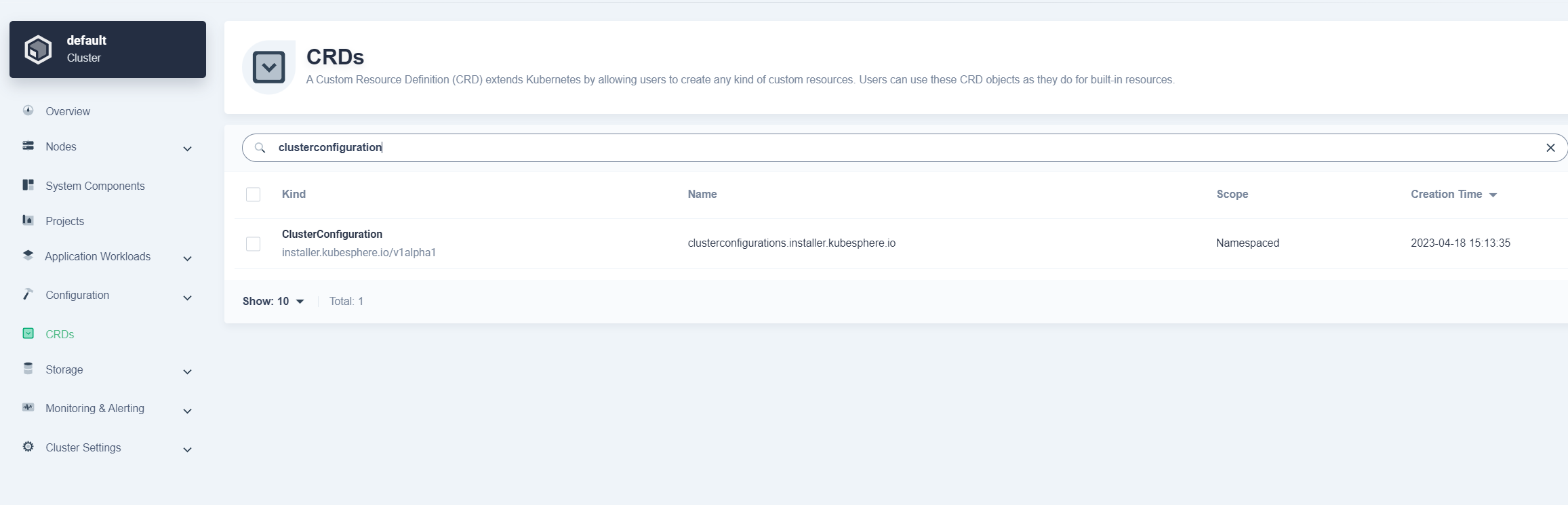 2. Click CRDs, enter clusterconfiguration in the search bar, and click the search result to view its detailed page.