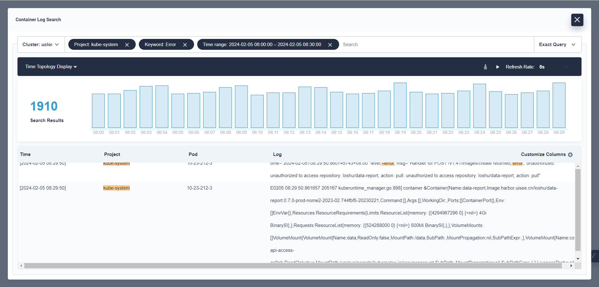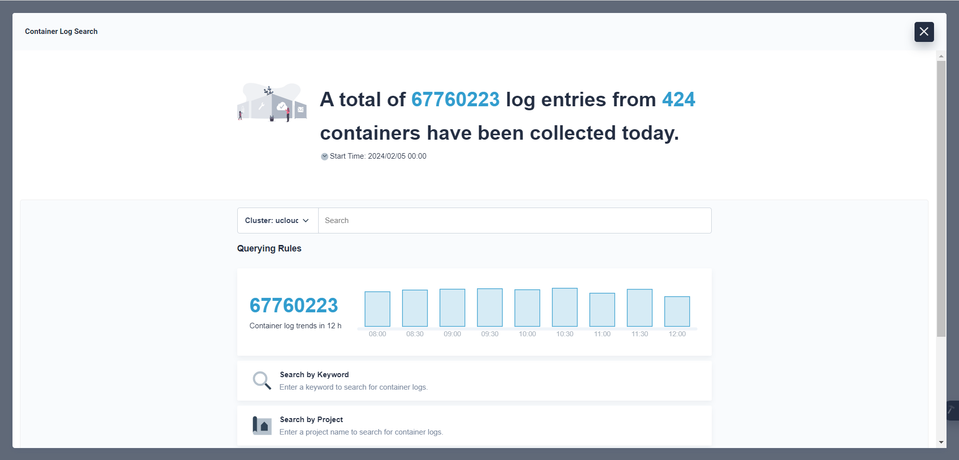 1. In the pop-up window, you can see the time histogram of the number of logs, the cluster dropdown list, and the log search bar.
