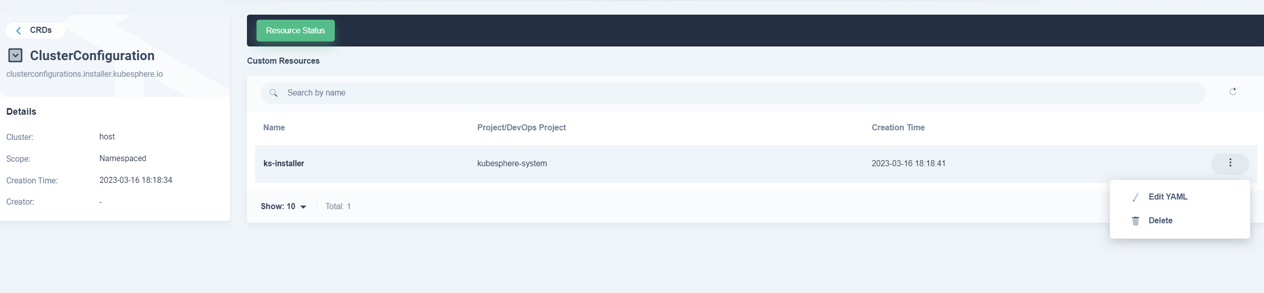 3. Under Custom Resources, click the three dots on the right side of ks-installer, select Edit YAML.